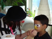 Boofa starting an all-over face painting design of the ever so popular red Angry Bird at Ian’s 5th birthday party. Ian chose the design off of Boofa’s party-themed face painting design sheet that was created special for his party! Note for face painters: Pack lots of red paint!