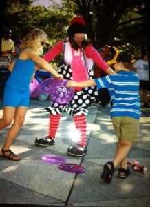 Ring around the Frisbees! Pockets full of Sillies! Here’s Boofa having fun with some kids at a charity walk using some “freebie” frisbees. Clowns take the ordinary and make it extraordinary! Another note for face painters: i use a frisbee as a base to hold my round palette of paints — perfect fit!