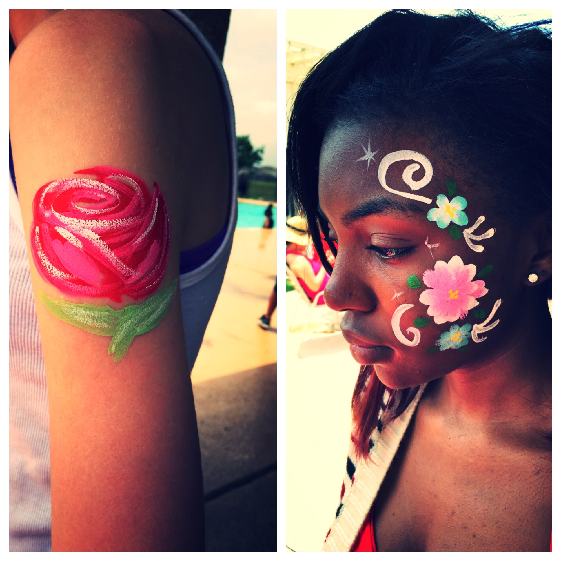 Boofa had fun painting all sorts of flowers, butterflies & alligators at a neighborhood pool bash! Alligators not shown in pic – they got away!