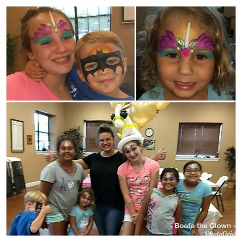 Boofa the Person had a magical time helping celebrate Denise’s 12th birthday! Unicorn face painting, personalized unicorn glitter tattoos and a unicorn balloon hat for the special tween! And of course, Batman was there too. 😉